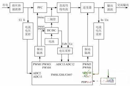 UPS要实现数字化控制,那么用更多的模拟器件才能实现的控制功能和算法就可以通过DSP的软件的编程来实现,所以整个UPS的结构就相比较用模拟器件的实现的UPS的整体结构要简单得多。如图1所示下面就是数字化的UPS的整体框图。主要由输入功率因数校正、逆变部分、DC/DC等组成。