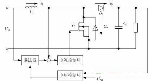 输入功率因数校正电路如图2所示主要由功率管T5、电感L1、二极管D1、电容C1组成。它为输入部分提供功率因数校正功能,并且提升电压至400V。