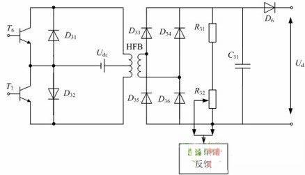 DC/DC电路的构成如图4所示,主要是由高频变压器、功率管T6、T7,整流二极管D33、D34、D35、D36,电容C31等组成。该部分采用直流电压环反馈控制,变换后的电压通过二极管D6与PFC的输出端相连。