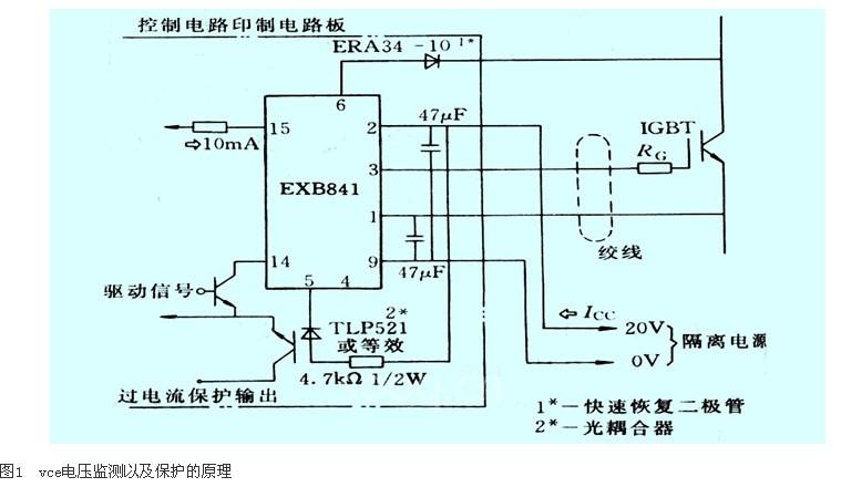 这是比较常用的方法。利用集电极电流ic升高时vge或vce也会升高的这一现象,当vge或vce超过设定允许值时,输出信号去封锁igbt的脉冲。由于vge在发生故障时变化较小,难以掌握,一般较少使用。而vce的变化较大,因此实际中一般常常采用vce监测法来对igbt进行保护。这种方法的优点是检测灵敏,动作迅速,有效地避免了并联回路igbt大面积损坏。但这种方法的缺点也比较明显:需要配线,将每个igbt的集电极与发射极之间的电压信号引入脉冲驱动板。另外由于igbt关断时,集电极与发射极之间的电压比较高,需要增加脉冲放大板相应的绝缘与电位隔离措施。图1是利用检测集电极与发射极之间电压vce对igbt进行保护的一个例子。