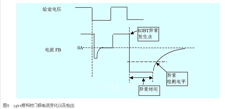 igbt元件正常时,当门极电压给定信号从on切换成off后,igbt门极电流ig数值比较小,具体数值与igbt元件有关,我们已经掌握了三菱3.3kv/1.2ka大容量igbt的电流数值以及延时时间。igbt损坏时门极电流变化以及检出如图5所示。当检测出igbt有异常时,立即发出脉冲封锁命令,防止故障扩大化。