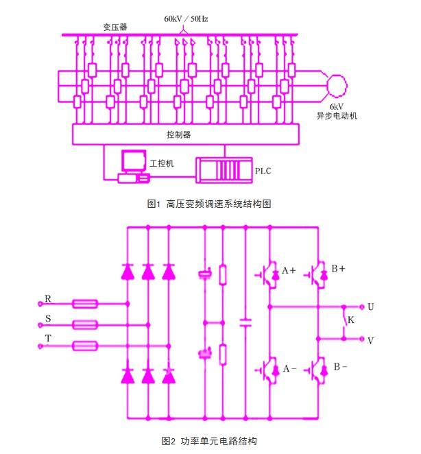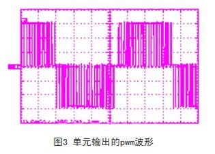 高压变频装置采用多电平串联技术,6kv系统结构如图1所示,整套系统由移相变压器、功率单元和控制器组成。6kv系列有21个功率单元,每7个功率单元串联构成一相。每个功率单元结构上完全一致,可以互换,其电路结构见图2所示,为基本的交-直-交单相逆变电路,整流侧为二极管三相全桥,通过对igbt逆变桥进行正弦pwm控制,可得到如图3所示的波形。