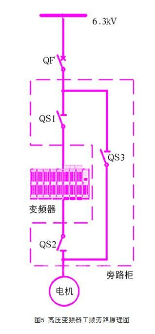 通过咨询,我们决定采用一拖一手动旁路方案:主回路由负荷开关qf、3个高压隔离开关qs1、qs2和qs3及高压变频器组成,如图5所示。其中要求qs2和qs3不能同时闭合,在机械上实现互锁。高压隔离开关qs1、qs2、sq3加装电磁锁,电磁锁的操作电源使用qf的辅助触点闭锁。只有当qf断开时,qs1、qs2、sq3的电磁锁才能得电,可以正常操作。在变频运行时,qs1和qs2闭合,qs3断开,变频器得电启动后,电机处于变频运行状态;工频运行时,qs3闭合,qs1和qs2断开,qf闭合后,电机实现工频直接启动,恢复改造前的运行状态。