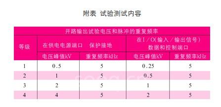 附表中列出了对设备的供电电源,保护接地,信号的控制端口进行电快速瞬变试验时应优先采用的试验等级的范围。(本文当中试验最终通过4级)