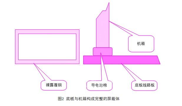 (2)底板设计成四层板,除了中间两层作为走线层以外,将最外侧的两层(顶层、底层)作为屏蔽层,与机箱配合,构成屏蔽体。底板与机箱之间连接,如图2所示,在线路板板上屏蔽层,与机箱配合预留一周导电层,在上面安装弹性电磁密封材料(例如导电泡棉),与机箱构成连续导电体。