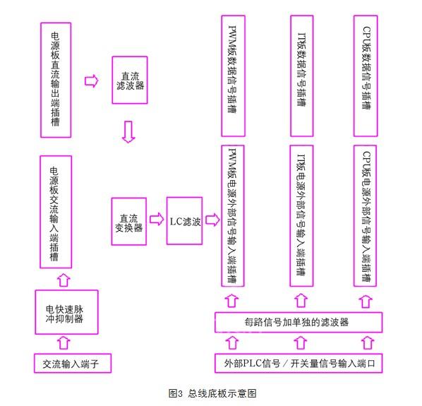 (1)改变控制板在底板上的位置,使其远离干扰最严重的电源端口(图3最左面两排端子),将其放置在底板的与电源端口相对的另一侧(图3最右端)。