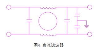 (7)在电源板的直流输出端插槽旁安装直流滤波器,将通过各种途径耦合到直流侧的电磁干扰滤除,具体方法是:在电源板上输出的直流电源安装直流电源滤波器,其原理框图如图4所示。