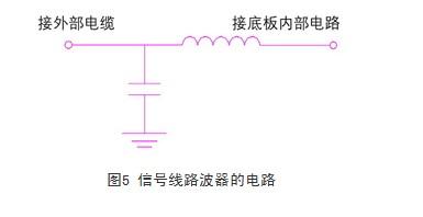 (8)底板上的外部plc信号/开关量信号的输入端口安装信号线滤波器,具体做法是:插座的每根信号线上安装如图4所示的滤波电路。图5中的电感为铁氧体磁珠(尺寸尽量大),电容为0.1μf,与底板上的屏蔽层相连。安装时,要尽量靠近插座。