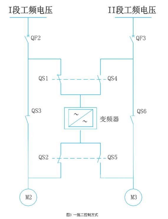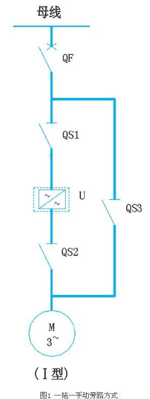 一拖一手动旁路方式是由3个高压隔离开关qs1、qs2和qs3组成,如图1所示。要求qs2和qs3不能同时闭合,在机械上实现互锁。变频运行时,qs1和qs2闭合,qs3断开;工频运行时,qs3闭合,qs1和qs2断开。