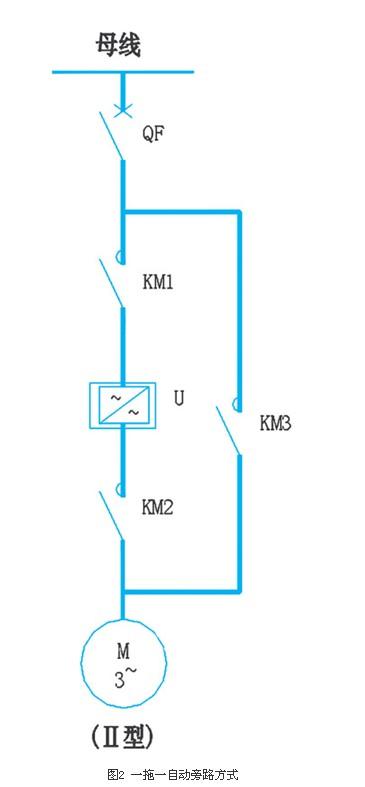 一拖一自动旁路方式是由3个高压真空开关(电流小于300a时选用真空接触器,电流大于300a时选用真空断路器)km1、km2和km3组成,如图2所示。要求km1、km2不能和km3同时闭合,在电气上实现互锁。变频运行时,km1和km2闭合,km3断开;工频运行时,km3闭合,km1和km2断开。
