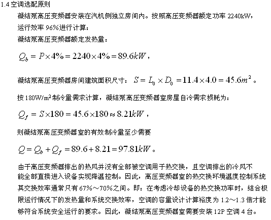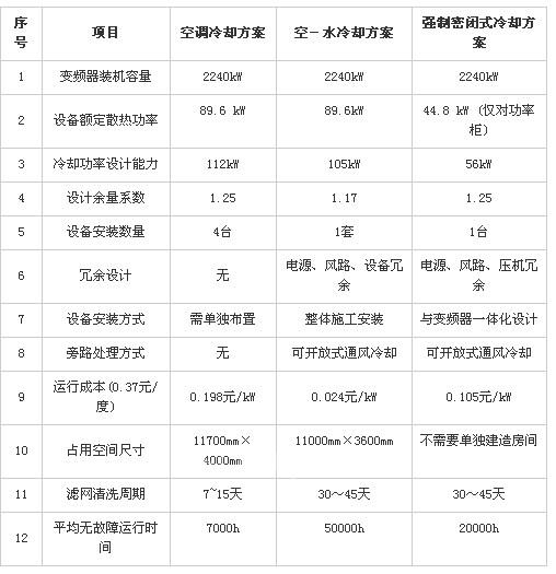 高压变濒器应用中的设备散热和运行环境问题直接影响设备自身的安全,随着变频器功率的不断提高,其辅助冷却的投资和运营成本也逐渐得到业内和客户的关注。采用专业的高压变频专用冷却系统,提高设备安全稳定性能,降低辅助冷却系统的运营成本,成为高压变频应用中需要考虑的重要问题之一。下面就以2240kW凝结泵高压变频器的冷却解决方案为例,对几种冷却方式进行可行性分析论证。