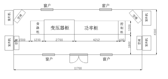 凝结泵高压变频器室内尺寸为:长11700mm,宽4000mm,高3500mm。尺寸平面布置如图1所示。