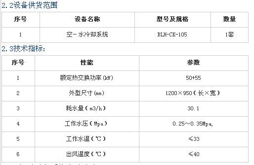 按照高压变频器额定功率2240kW,运行效率96%进行计算:2240kW的高压变频器的最大散热功率为,2240×4%=89.6kW。由于该系统将高压变频器排出的热风全部通过空水冷却装置实现了热交换,然后将冷风排回室内,因此,其风路循环效率得到极大提高。风路循环效率接近99%。考虑到极限运行情况下的发热量,以及水温偏高、系统交换效率等因素,空冷器的设计裕度通常选择为1.15~1.2倍。以设计裕度1.15进行计算,空冷器的热交换功率不小于103.04kW/台,实际选用的空冷器功率为105kW。