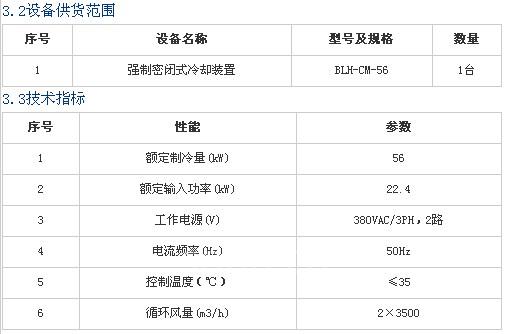 强制密闭式冷却装置按照单台高压变频装置的功率柜为对象进行对等配置。2240kW的变频器配置的闭式冷却装置功率值=2240×2%×1.25(设计裕度)=56kW,实际选用56kW的闭式冷却装置。根据闭式冷却装置的设计原则,该套冷却系统仅限于对温度要求较高的功率柜进行配置。变压器柜采用开放式冷却,温度散失到环境中;允许温升80K,高温报警值120℃完全能够满足运行安全的要求。