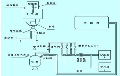 气力除灰系统以仓泵为发送器,以压缩空气作动力,沿除灰管道将电除尘器搜集的飞灰干法送至灰库,整个过程以密封管道的形式输送。系统设有专用空气压缩机作为干灰输送动力并兼作控制气源,在系统末端设有储存粗灰、细灰的干灰库。其中电除尘器中一、二电场的灰是粗灰,三、四电场的灰是细灰。正常情况下,三、四电场的飞灰只能送进细灰库,一、二电场的粗灰只送进粗灰库。当细灰库出现故障时,细灰可以送到粗灰库里。