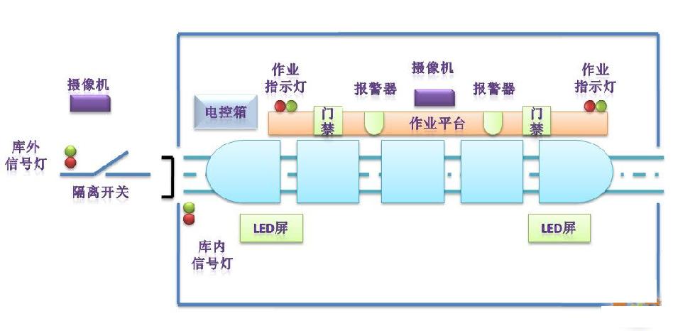 库外25米处设有入库信号灯,库大门处设有出库信号灯。3层检修平台入口设有电磁门禁锁和门禁指示灯,检修人员使用经过授权的门禁卡才能上下三层检修平台。库前端设有电控箱,可对库外隔离开关进行远程控制。视频监控系统通过库内和库前的摄像头对隔离开关和库内人员作业进行监视控制。其布局如下图1所示: