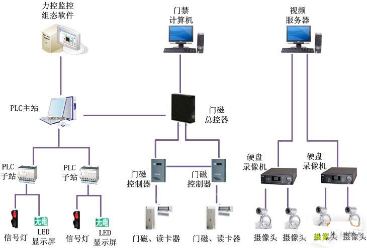 门禁子系统设有专门的门磁控制器,安装在各个检查库,数据通过专线传输到门磁总控器,所有门禁数据可在专设的门禁计算机中显示。同时PLC主站可调取门磁总控器的数据,上传到力控监控组态软件实时显示各个门禁的状态。
