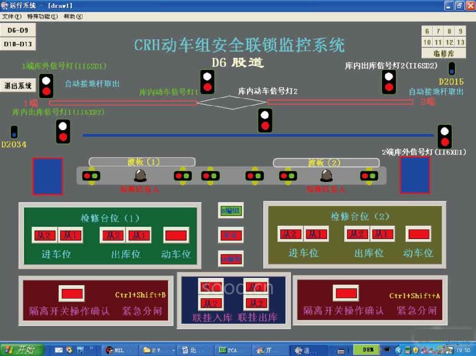 2)直观性:安全联锁系统的列车进入库状态、信号灯、接触网有无电、大门信号和爆闪灯等功能都以图片或动画的形式综合体现在力控组态软件的控制界面上。同时,各种工位的状态显示栏和操作按钮都有序的排列在控制界面的下方。系统的状态提示和控制操作可以在同一界面进行操作。图4所示为安全连锁系统控制界面。