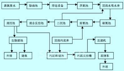 江苏沙钢集团宏发焦化厂化产车间污水处理工段主要接受来自其他工段的蒸氨废水及煤气水封水。首先进行废水的预处理,废水进入除油池,在两台批油装置机的作用下初步去除污水中油污杂物;通过气浮装置的2台污泥刮渣机去除表面的泡抹,将较小的漂浮物去除;其次进行生化处理。主要是通过厌氧池、缺氧池和好氧池进行一系列的化学反应。经过简单预处理过来的水在厌氧池、缺氧池及好氧池进行反硝化反应,炭化反应和硝化反应,降低污水中的cod、氨胆含量以及溶解氧;接下来通过加混凝剂沉淀污水中的悬浮杂质,最后进行净化过滤处理,将处理过的水在指标达标后进行排放,处理下来的污泥用带式压滤机压榨后可以作为再生资源利用。工艺流程见附图所示。