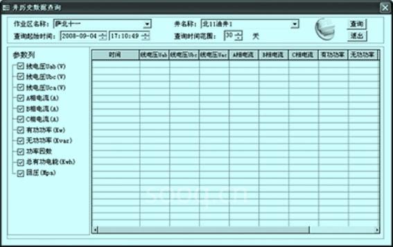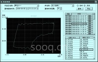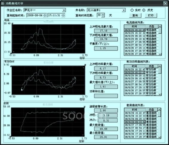 系统菜单包括:系统设置,数据采集,曲线数据,历史数据,报表打印,数据统计,使用帮助,退出系统。利用导航数组件,用户可以方便的选择相应的设备名称,油井当前的各项参数可以直观的显示在界面中,电流、功率、载荷以曲线图的形式显示。各种曲线提供历史查询和打印的功能,分别如下所示。