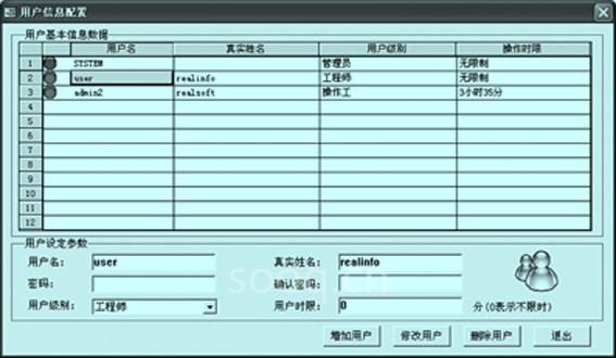 (4) 具有管理员权限的用户可以增加、修改、删除用户,每一个用户都可以设置用户名、真实姓名、密码、用户级别、用户时限等。不同的用户有不同的操作权限,如图7所示。