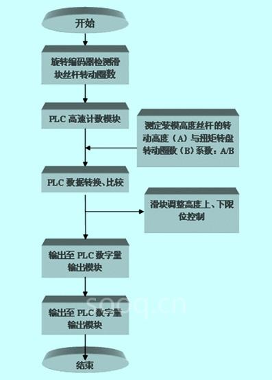 为解决上述问题,汽车行业普遍采用编码器解决方案。此方案利用旋转编码器记录滑块高度,将信号送给欧姆龙plc高速计数模块,经过欧姆龙plc处理转化为十进制数值,然后显示滑块高度。编码器方案的程序框图如图1所示。