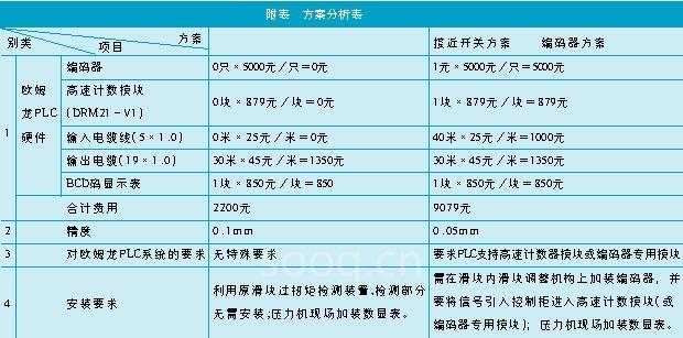 但是对比接近开关方案,编码器方案的成本投入大,同时要求plc能支持高速计数模块,对现场的环境要求高。两种方案的比较参见附表所示。