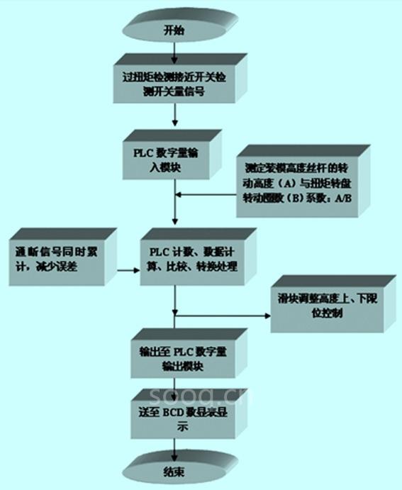 目前,我们采用的是接近开关方案。此方案通过接近开关检测压力机机械传动轴旋转的圈数,将信号送到欧姆龙plc,经过内部程序处理,输出到欧姆龙plc数字量输出模块,在bcd码显示器上显示滑块高度。接近开关方案的程序框图如图2所示。