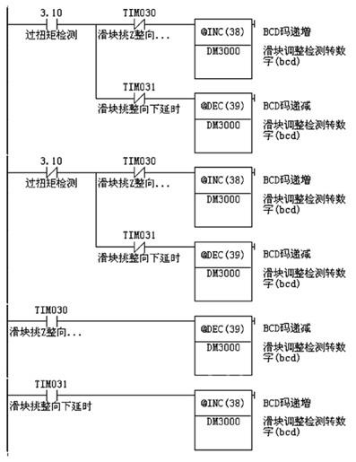 (1)利用压力机设备上现有的接近开关,检测滑块调整机构丝杆旋转的圈数,将检测到的圈数送入欧姆龙plc。我们运用欧姆龙plc的特殊指令inc和dec,通过bcd递增和递减功能来实现传动轴正转和反转时,检测圈数的加减。程序如下:
