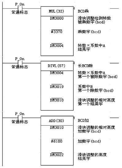 (3)经过程序的运算,将传动圈数乘以传动系数,就可以得出滑块调整高度的当前值,再通过欧姆龙plc将数值以bcd码的形式,在欧姆龙plc的输出模块(oc222),以继电器形式输出。程序如下: