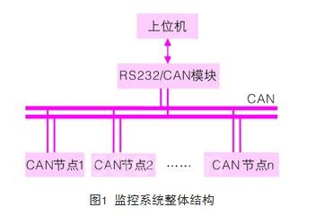 整个监控系统(如图1)是一个分布式控制系统,由三部分组成:上位机、转换模块、can节点。上位机负责监控整个系统的运行状况;转换模块作为各个节点与上位机的通信中介,实现上位机与节点间的双向通信;各个can节点均可以在任意时刻,遵循通信协议完成上传信息和执行控制命令等任务。