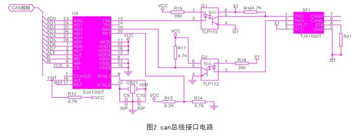 设计中选择sja1000控制器并采用其性能优越的pelican扩展模式。can收发器tja1050是philips公司生产的高速can总线驱动器。tja1050具有速率高、低功耗、电磁性能优越等特点。can接口电路如图2所示。