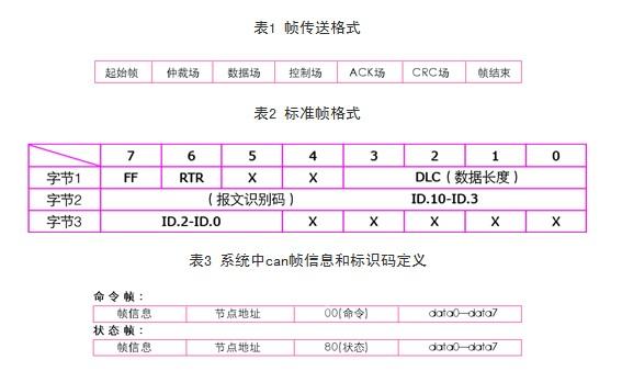 标识符id10~id3代表模块地址,所以协议理论上可满足256个控制节点,标识符id2、id0以及该字节后六位定义为帧类型:命令帧或状态帧,数据信息这样划分简单明了。上位机根据模块地址收集判断节点信息,并下发相应命令。协议还规定,按优先权由高到低,从低向高为模块分配地址,以保证总线竞争中优先权高的节点能更先占有总线。