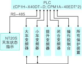 系统上电后,在无故障反馈情况下,司机室驾驶员通过操作控制台给出运行指令,plc按照一定的指令逻辑关系,控制变频器以一定的速度工作;天车运行全程故障监视,轻故障声光提示,重故障紧急停机。运行数据及历史记录通过rs485串行通讯接口传送到触摸屏用于监视,以便于驾驶员对运行状况能准确的把握,同时也便于工作人员维护。