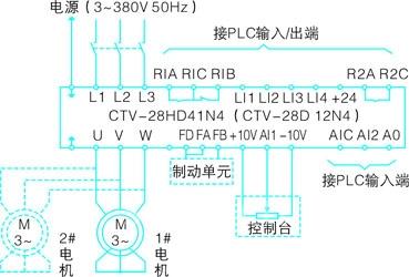 (4)闭合变频器选用ctv-28hd38 n4 28kw 20hp 54a 380v 50hz 1台。