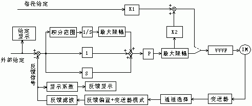 在本系统利用变频器作为执行机构控制异步电机同步运行,在保持速度一致的情况下,通过控制电缆收线的张力大小恒定,保证了主从电机的稳步运行和收线卷的质量,避免速度不稳和受到外界干扰产生的较大误差。这里主要利用了变频器的强大功能来实现电机传动的控制,摒弃了模拟量控制系统,实现产品的机电一体化。
