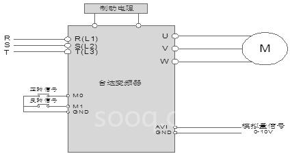 控制系统接线图如图1所示。选配电机为3.0KW/50Hz/380V,选用变频器型号为VFD037M43,制动电阻400W/150ohm。