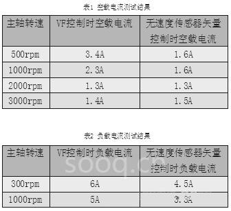 从表1和表2可以看出在恒转矩输出的频率段(0-50Hz),矢量控制的空载电流几乎只有VF控制的一半,负载时电流也比VF小一些;而且负载切削时,VF控制在初期有很明显的速度下降,而且空载速度和负载速度有比较大的差值。而相对于矢量控制,主轴转速初期虽然也会有下降,但是下降值较小,并且速度会很快回升,最终空载速度和负载速度相差不是很明显。经过上面的调试,与VF控制比较,性能有了很大的改善,无论从空载电流,低速力矩,还是速度的变化,效果都是非常明显的,完全能够满足数控机床的需求。投入运行后,使用效果令人满意,说明台达M系列变频器在车床主轴控制系统中的应用是成功的。