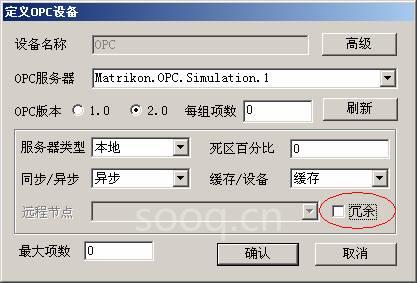 当进行OPC驱动设置时,在进入OPC设备定义对话框后单击“冗余”选项,会弹出冗余设置对话框,如下所示: