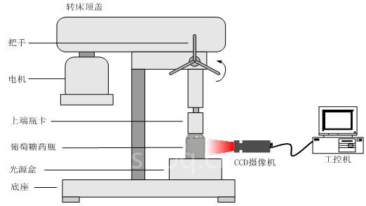 基于机器视觉技术的葡萄糖药液质量检测,可以实现无接触式的检测,在药品安全上和检测精度上都对传统人工检测有着重大的改进。根据葡萄糖药液杂质检测的特点设计了专用的视觉成像方案。如下图所示,待检测的葡萄糖药瓶被卡在转床上,转床旋转的时候带动药瓶高速旋转,用于机器视觉的专用LED光源安装在如图所示的光源盒内,CCD摄像将拍摄到的图像传输到工控机。在此过程中连续拍摄7幅图像,在这一序列的运动图像中,对运动目标进行识别; 当识别到的目标超过规定的容许指标时,判断此瓶药液为不合格。