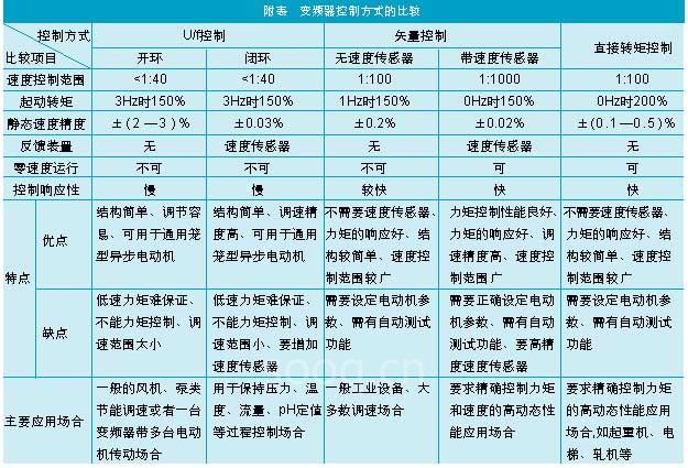现在市场上出售的变频器种类繁多,功能也日益强大,变频器的性能也越来越成为调速性能优劣的决定因素,除了变频器本身制造工艺的“先天”条件外,对变频器采用什么样的控制方式也是非常重要的。附表1综述了近年来各种变频器控制方式的性能特点。