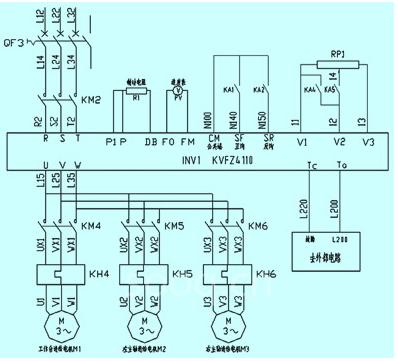 变频器出现异常时,通过它内部的报警继电器驱动控制柜上的报警指示灯hl1,使hl1连续闪烁,指示操作人员变频器出现异常,必须立即停机检修。变频器报警延时0.5秒后,切断输入侧的接触器km2,使出现故障的变频器脱离电源,以免故障进一步扩大。
