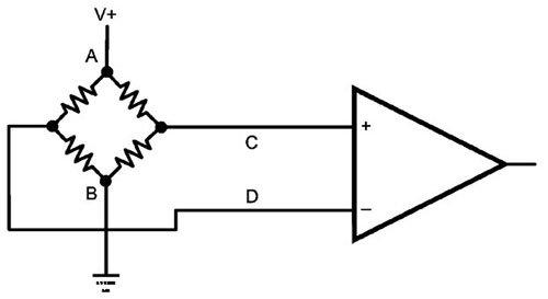 例如,正常使用时,如果电桥没有应变,放大器的输入则应为V+/2。如果输入在C点和D点短路,放大器的输入仍是V+/2。但是当电桥应变时,放大器输入端将不再出现电压差,每路输入电压都将保持在V+/2。该故障可用如下方法检测:在C点注入小电流,之后测量压降。如果没有短路,放大器会测出电桥内电阻上的压降;如果在C点和D点短路,压降就会非常小。