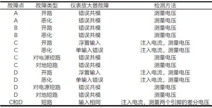 表1给出了每种故障及其相应的检测方法。例如,如果B点的连接开路了,仪表放大器的两个输入端电压都会被拉到V+。通过测量仪表放大器的一个输入,只要该输入的共模电压不是预期的V+/2,就说明确实发生开路了。