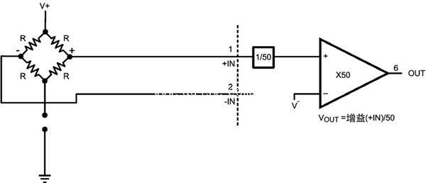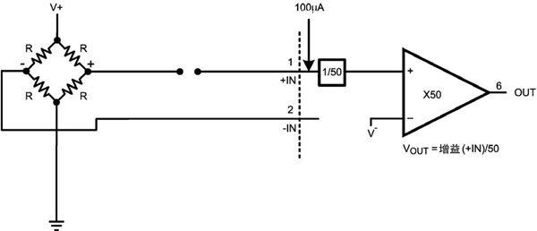 另外一个例子是图1中的C点开路。仪表放大器输入的浮动会引起输出浮动。该故障可通过下列方法检测:将50分频模块插入信号路径,增益设为50,然后在输入引脚处注入电流。如前例,50分频模块将保证输入在仪表放大器的输入共模电压范围之内。电流会使输入拉高到V+,输出也为V+,图4示意了这种设置。