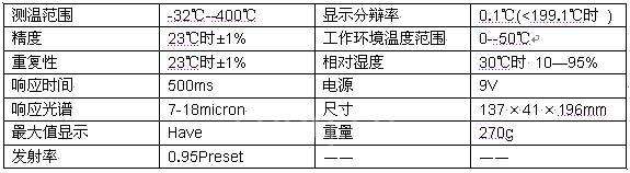 红外测温仪是通过接收目标物体发射、反射和传导的能量来测量其表面温度。测温仪内的探测元件将采集的能量信息输送到微处理器中进行处理,然后转换成温度读数显示。在带激光瞄准器的型号中,激光瞄准器只做瞄准使用。其性能说明下表。