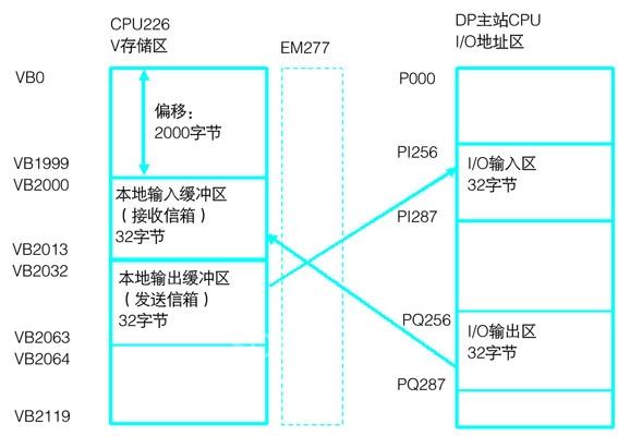 在dcs系统上位机中安装好em277模块的gsd文件,组态好主站的通讯地址及通讯接口数据区.软件组态的em277 profibus站地址要与实际em277上的拨码开关设定的地址相一致,通讯接口区大小为32字节输入和32字节输出,在主站设定v区的偏移值为2000。设置完成后通讯接口的数据对应关系如图3。