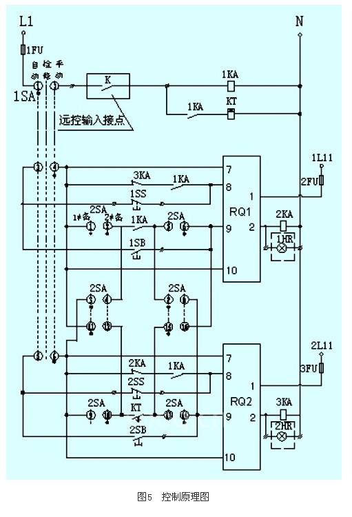 其中rq为tjnr1系列内置旁路型在线运行软起动器,ka为中间继电器,1sa为选择自动投切还是手动投切的转换开关,2sa为选择备用回路的转换开关,k为远控输入接点,kt为时间继电器,sb为接通按钮,ss为断开按钮,hr为运行指示灯。1、2为软起动器的编程输出端子,7、8、9、10为软起动器的外控起停控制端子。