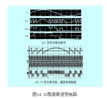 本方法主要针对非对称混联逆变电路。为了实现输出电压波形的连续调幅,需要对多电平电路进行pwm控制。同时为了降低脉冲阶跃幅度带来的电磁干扰,连续调幅时产生的脉冲不超过1v。图14为23型3级h桥非对称混联逆变电路(三个级联单元的直流电压比为1:2:4)的混合pwm调制方法示意图。首先对电压为2v和4v单元按图14(a)中的iii、iv波形进行驱动,然后将i中正弦调制波和iii、iv波形相减,得到1v单元的调制波ii。再用ii和三角载波进行调制,形成1v单元的pwm驱动波形,如图14(b)所示。显然,该法只对1v单元进行了pwm调制,因此在选择器件时,就可以在2v和4v单元使用低频大功率器件,如igct;而在1v的pwm单元采用高频小功率器件。