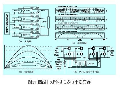 有些学者为非对称混联多电平逆变电路提出了主从逆变单元的概念。主逆变单元(master)就是串联连接的逆变器中,直流电压最高的单元,它承担级联逆变器大多数的功率,通常由gto、igct完成,同时通过dc/dc双向功率电源向从逆变单元(slave)供电。其它的逆变单元称为从逆变单元,直流电压较低,只负责完成自己的逆变任务。图17所示为(a)(b)(c)(d)分别为4级连接81电平的逆变器主电路、输出波形、功率分配情况及dc/dc双向功率电源。
